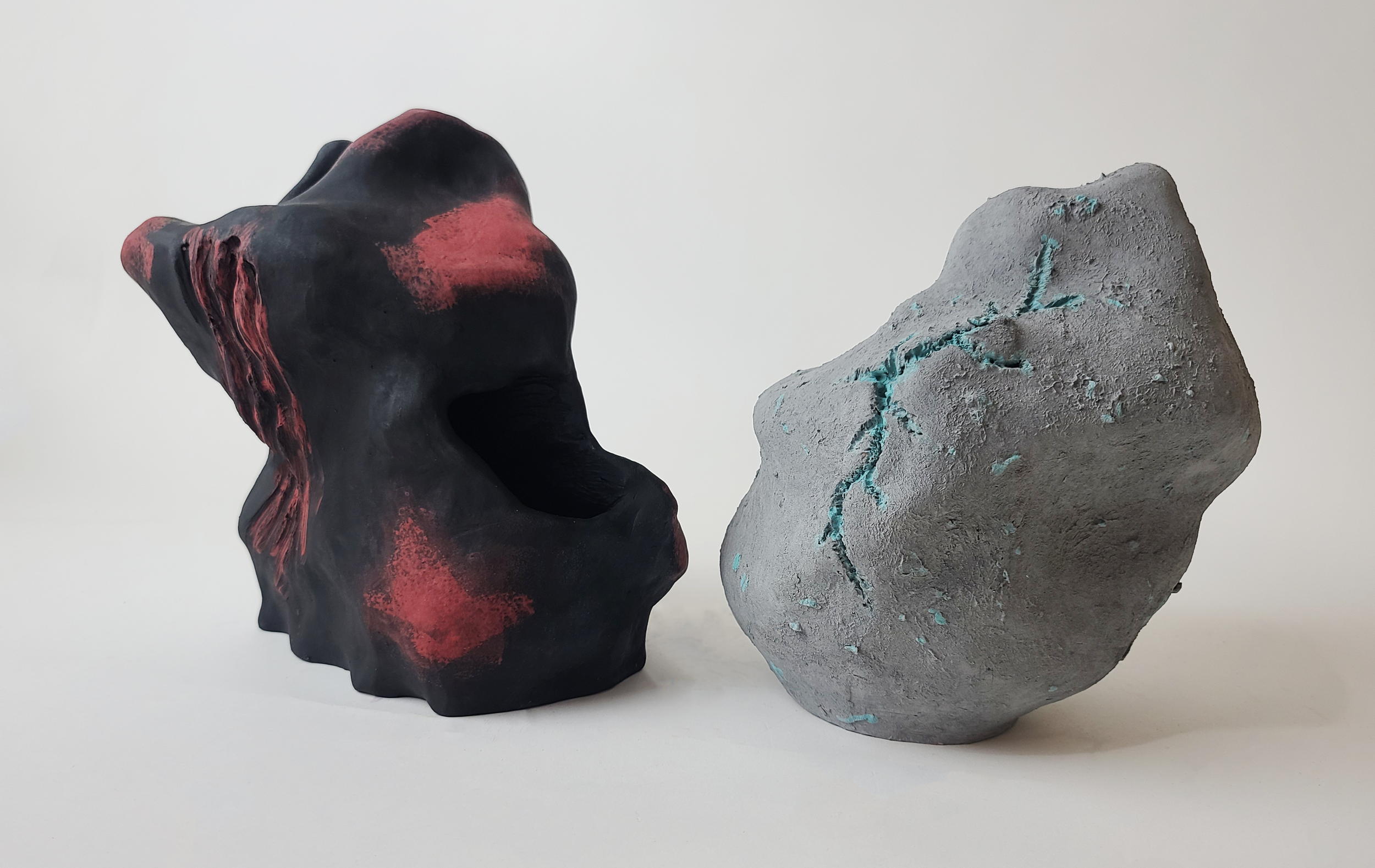 Split Seconds / Dust Settling is a ceramic diptych exploring my relationship with chronic illness. Split Seconds reflects the fear and chaos I felt when I was first diagnosed through dark, fragmented forms. Dust Settling contrasts this with a quieter, more grounded composition representing my thoughts now that acknowledges lasting scars while embracing resilience. Together, the pieces capture the shift from overwhelming disruption to a hard-earned sense of stability.