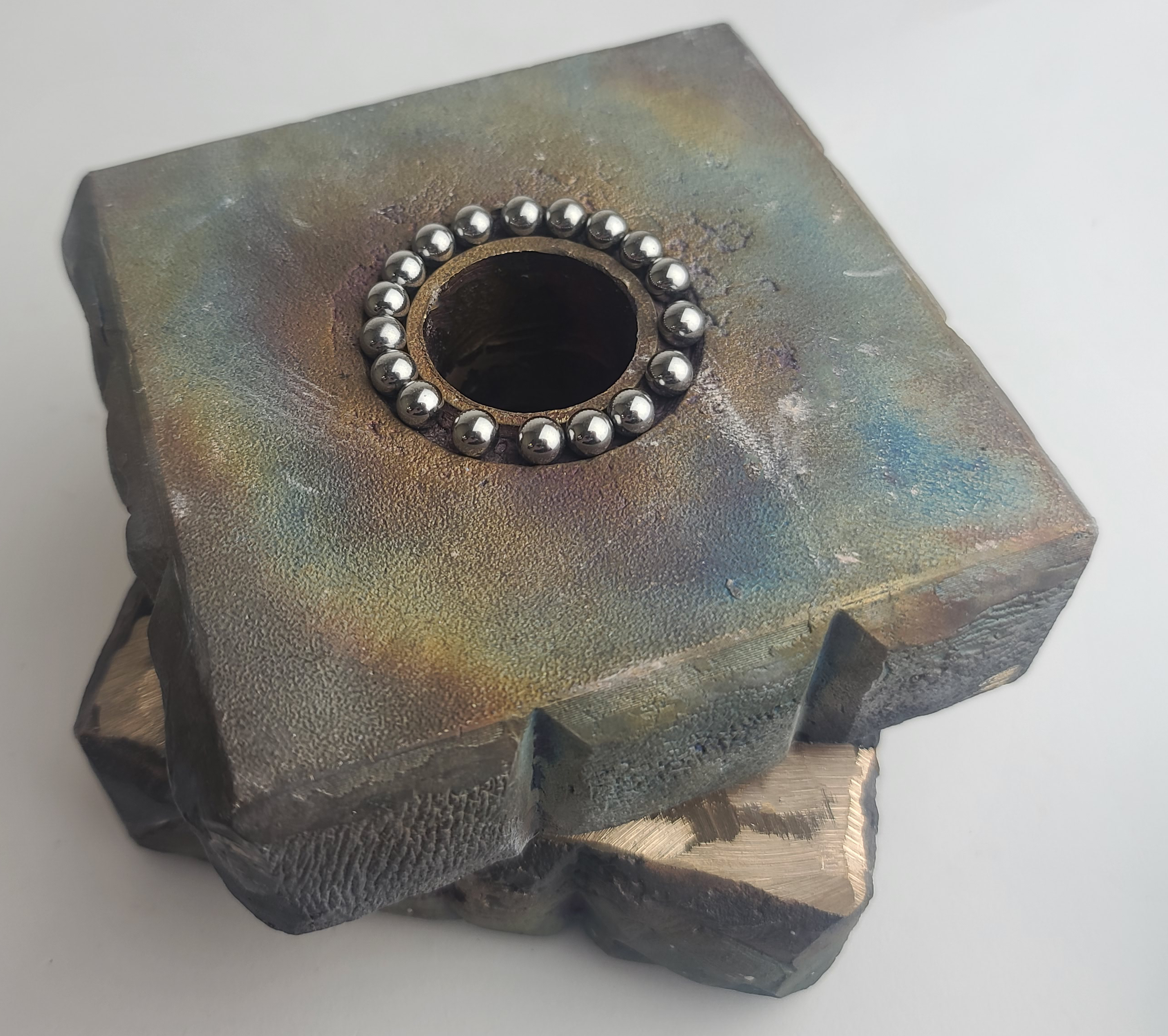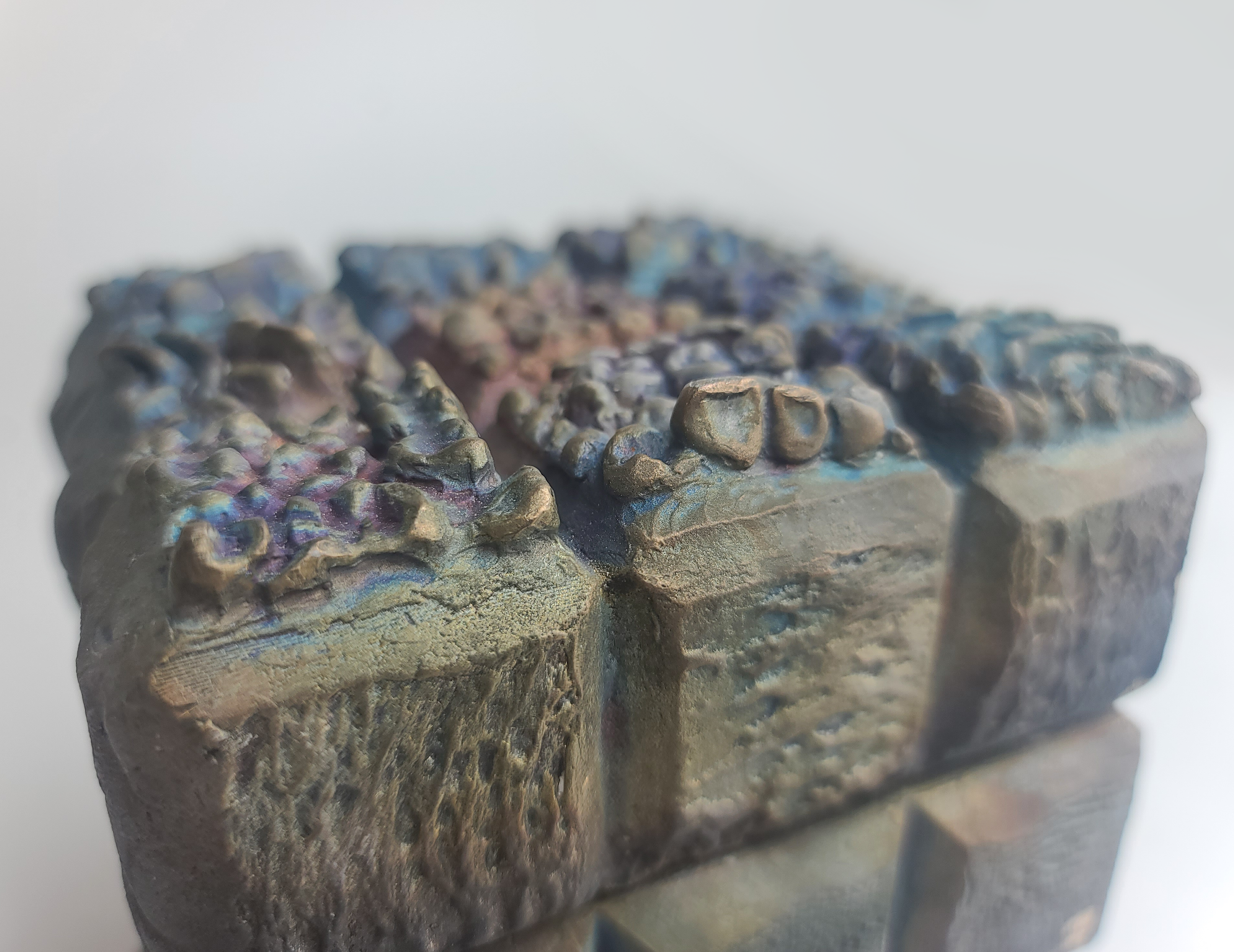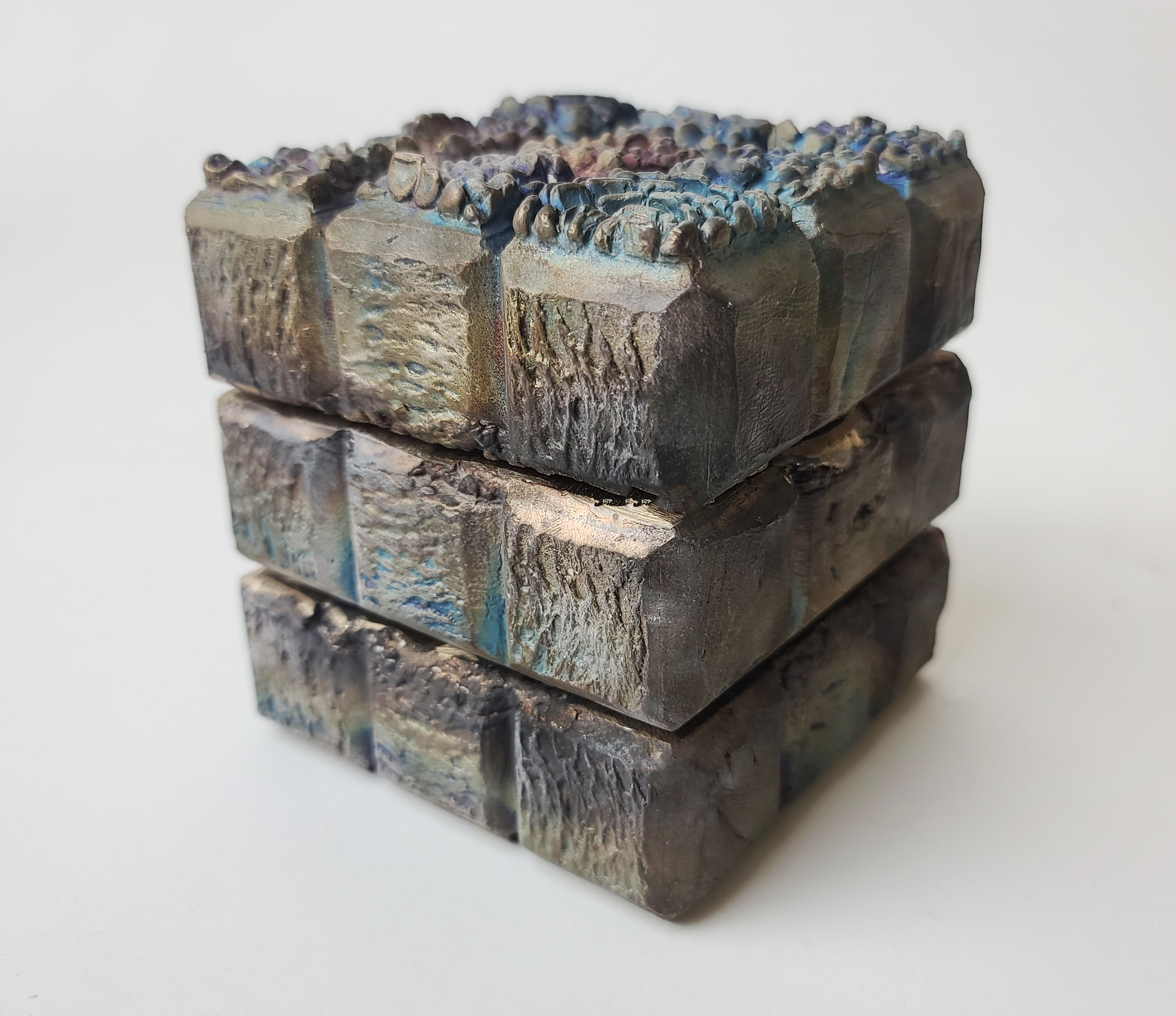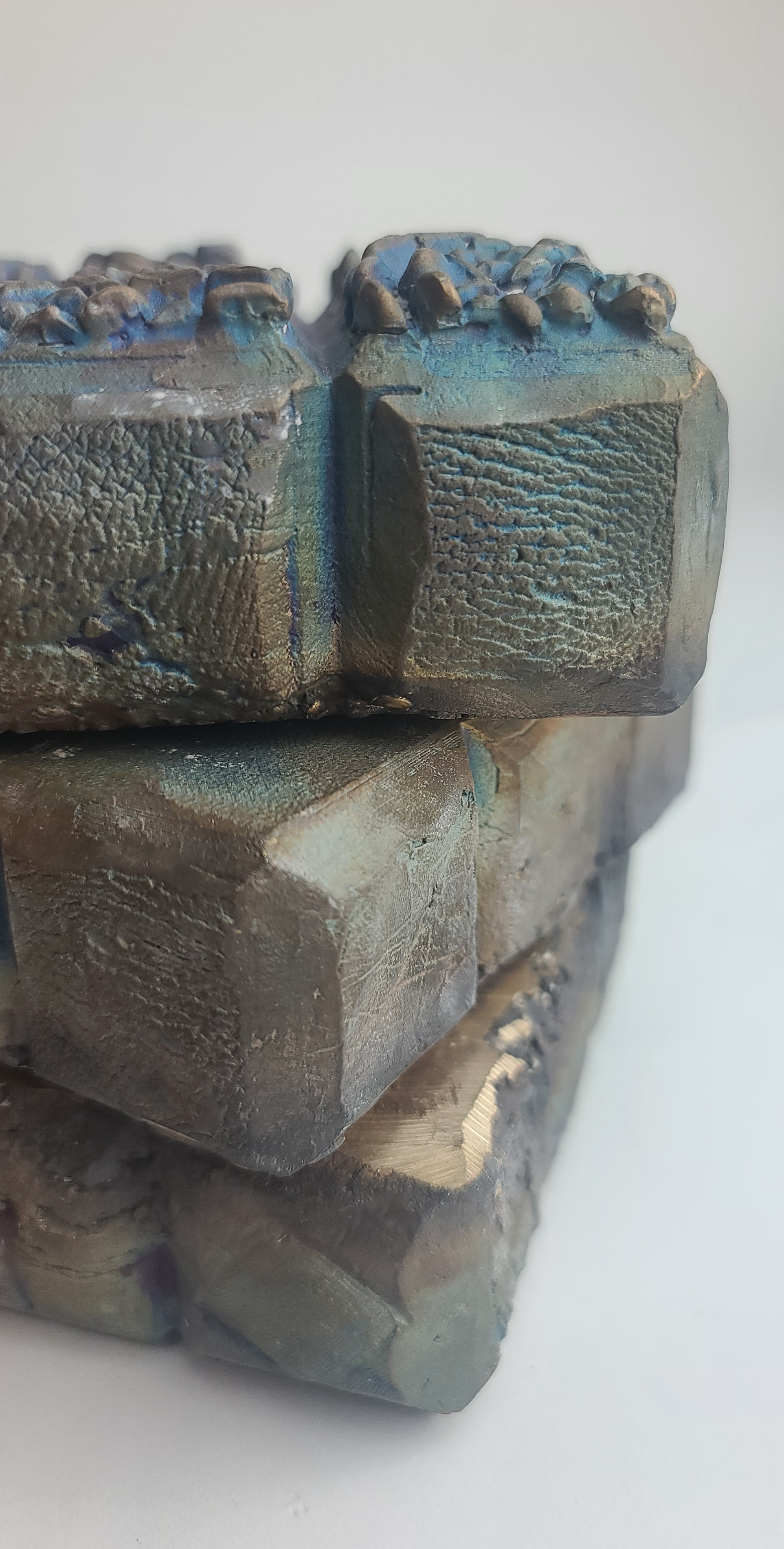 The resulting sculpture is a tactile, functional Rubik’s Cube, with each rotating face symbolizing the different facets of identity and the constant challenge of aligning them. The layers are able to spin, thanks to 30 ball bearings placed between each, representing the tension and movement within one's personal journey. The cube’s ability to turn echoes the process of self-discovery and the attempt to solve a self that feels fragmented, while the bronze, permanent and unyielding, serves as a reminder of the solidifying nature of experiences over time. Through this piece, I aim to capture the ongoing struggle of reconciling the pieces of oneself and the sometimes elusive nature of inner harmony.